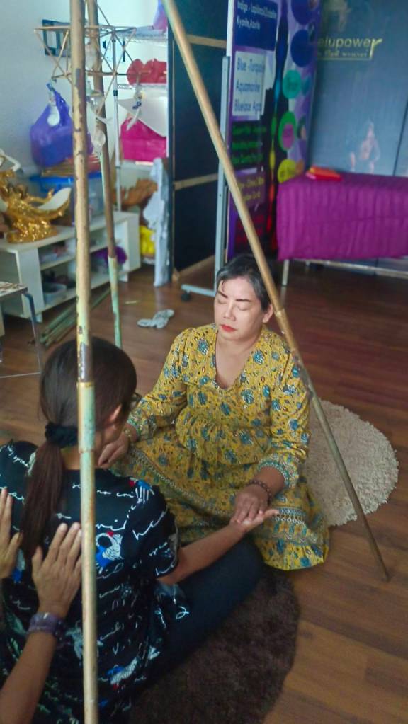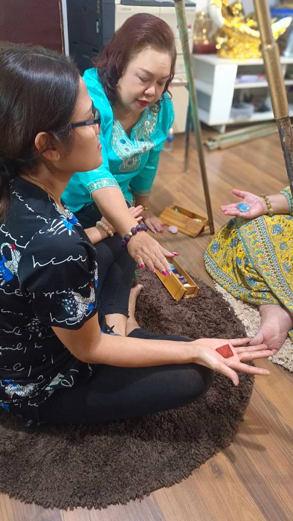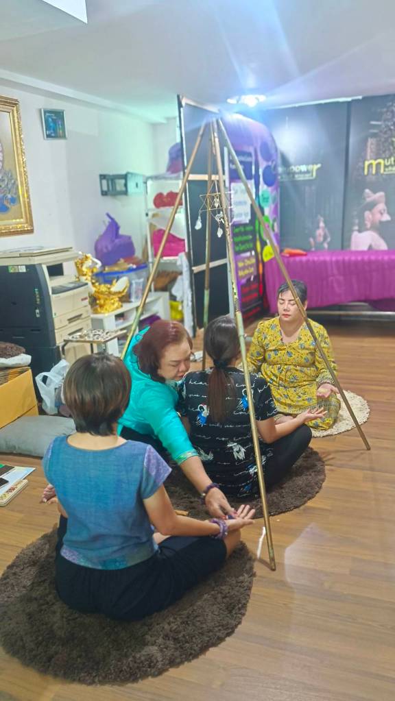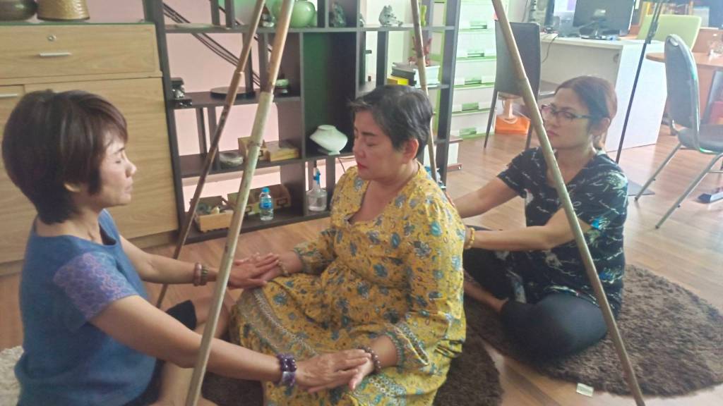 อาจารย์เป็นแค่ผู้ชี้แนะแนวทาง แนะนำเรื่องหินสีที่ใช้วางเพื่อการบำบัดตามจะกล่าวต่างๆบนร่างกาย แนะนำคุณสมบัติของหินว่าบำบัดโรคทางกายและใจประเภทใดได้บ้าง แนะนำเรื่องเรกิ ออร่า แสง สี และการสั่งจิตใต้สำนึก วันที่ 2 เป็นช่วงของการฝึกปฏิบัติ มีทั้งให้นอนบนเตียงบำบัด วางหินสีตามจักระ ส่งพลังบำบัดให้ผู้อื่น มีทั้งให้ลงนอนที่พื้น ในท่าที่สบายที่สุดของตัวเอง เพื่อฟังเสียงบำบัด 1.ลบล้างลืมอดีตที่ผิดพลาด 2.พลังจิตบำบัดโรค 3.ลดอารมณ์โกรธอย่างไรให้ได้ผล4.พลังแห่งความสำเร็จ และฝึกรับรู้พลังของหินสีแต่ละก้อน ฝึกการถ่ายทอดพลังให้ผู้อื่น และรับรู้พลังจากผู้อื่นขณะที่เราอยู่ในสมาธิ