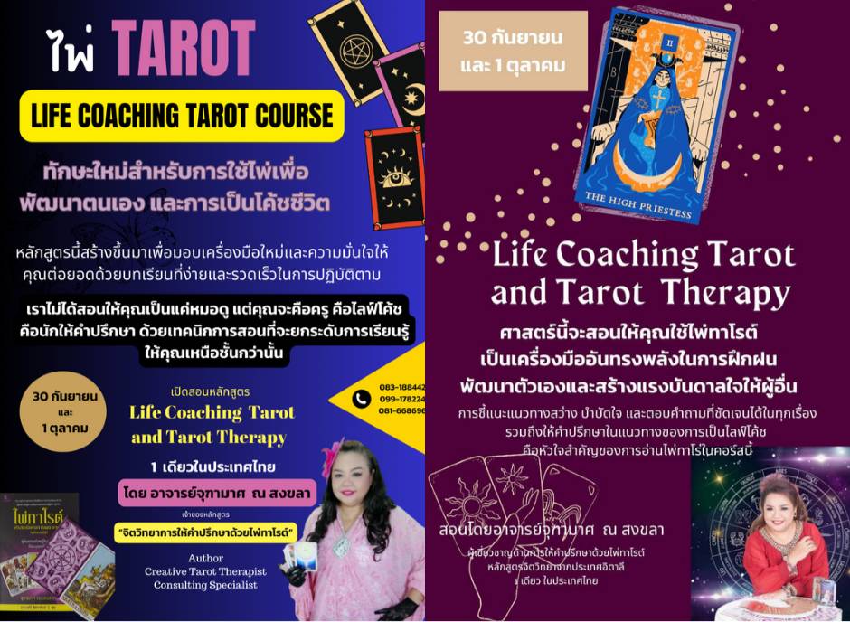 👉เปิดสอนไพ่ทาโรต์หลักสูตรเพื่อการเป็นไลฟ์โค้ชและนักบำบัดหลายปีกว่าจะสอนสักครั้ง และหลายปีมานี้อาจารย์หญิงก็แทบไม่ได้ทำอาชีพนักพยากรณ์เลยค่ะ แต่หันมาบำบัดด้วยไพ่เรียกว่า coaching and Counselling with Tarot therapy โดยคิดค่าบำบัด ชั่วโมงละ 2,900 บาท
